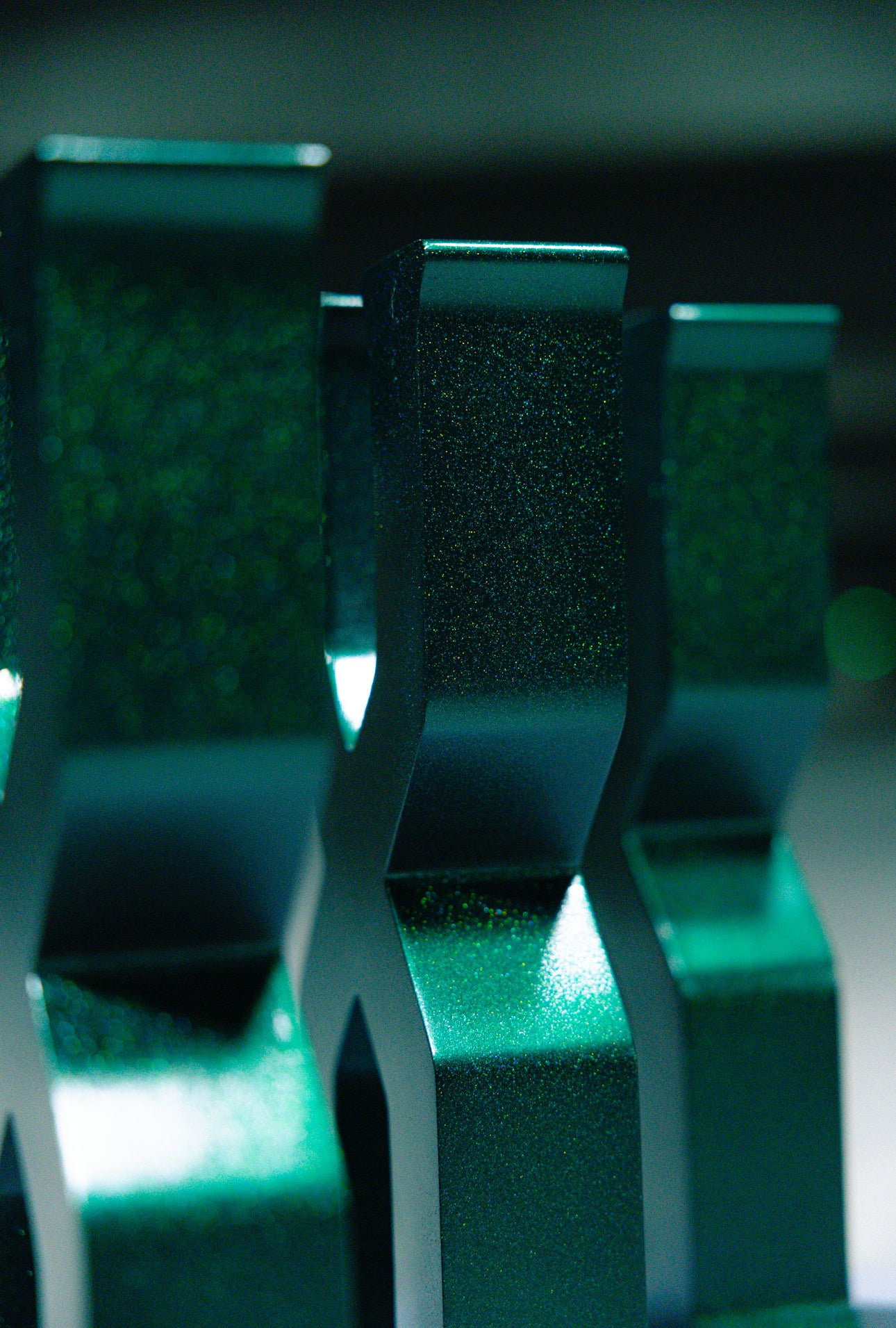3D printed with cross hatching filler for solid structural integrity, sanded by hand, 2x primed, 5x coats of paint featuring a “cosmic green” color that sparkles in the light. Lastly 3x layers of clear coat.
